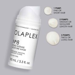 Olaplex No. 8 Bond Intense Moisture Mask is a concentrated, reparative mask designed to provide intense moisture, smoothness, and body to damaged hair. Utilizing Olaplex’s patented Bond Building Technology, this mask works to repair broken bonds, strengthen hair from within, and restore its natural health and vitality. Its rich, creamy formula deeply penetrates the hair to deliver essential hydration, leaving hair visibly healthier, shinier, and more manageable. Suitable for all hair types, Olaplex No. 8 Bond Intense Moisture Mask is ideal for weekly use to maintain strong, resilient, and lustrous hair.